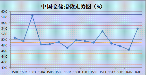 中國物流與采購聯(lián)合會與中儲發(fā)展股份有限公司聯(lián)合調(diào)查的2016年3月中國倉儲指數(shù)為53.8%,較上月大幅回升7.4個百分點。各分項指數(shù)中,收費價格指數(shù)、期末庫存指數(shù)及業(yè)務(wù)活動預(yù)期指數(shù)出現(xiàn)回落,其余指數(shù)均有不同程度的回升。